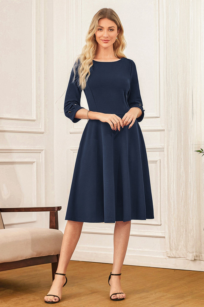 GK Women Boat Neck Dress OL 3/4 Sleeve Below Knee Flared A-Line Dress