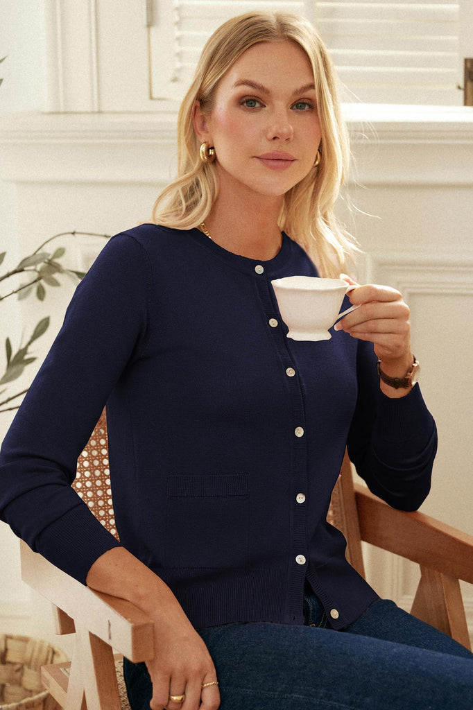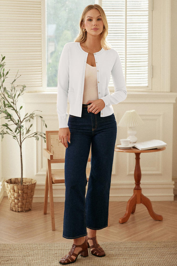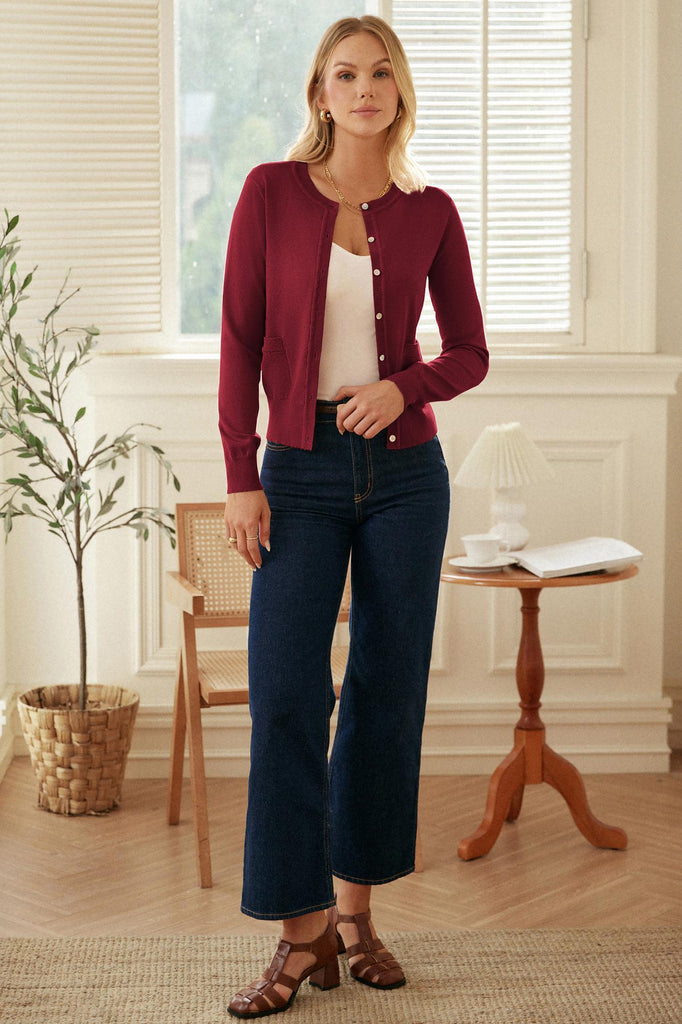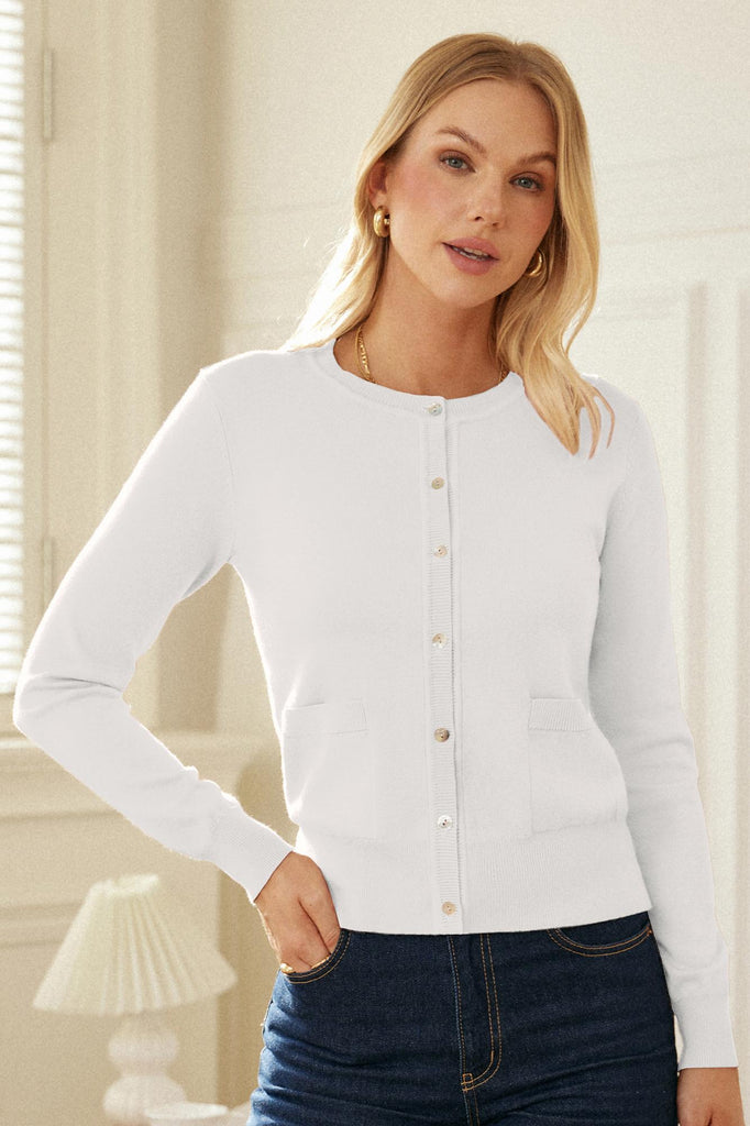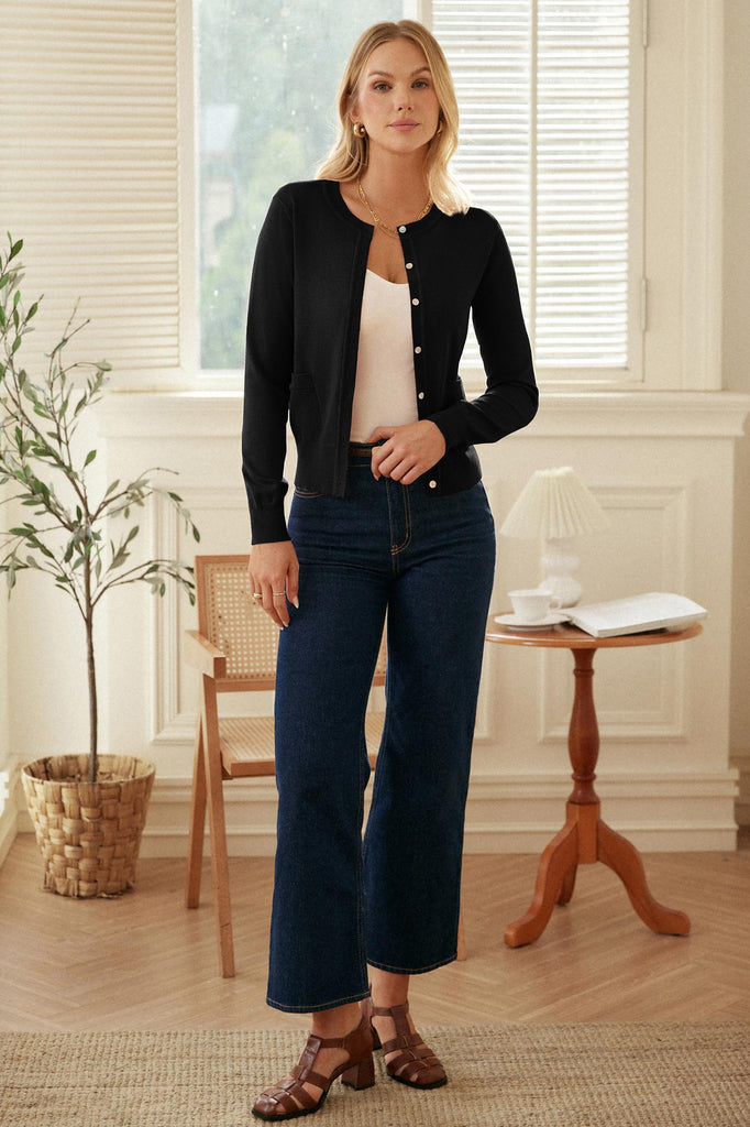 GK Women Ribbed Cuff Cardigan Long Sleeve Crew Neck Button-up Sweater Knitwear