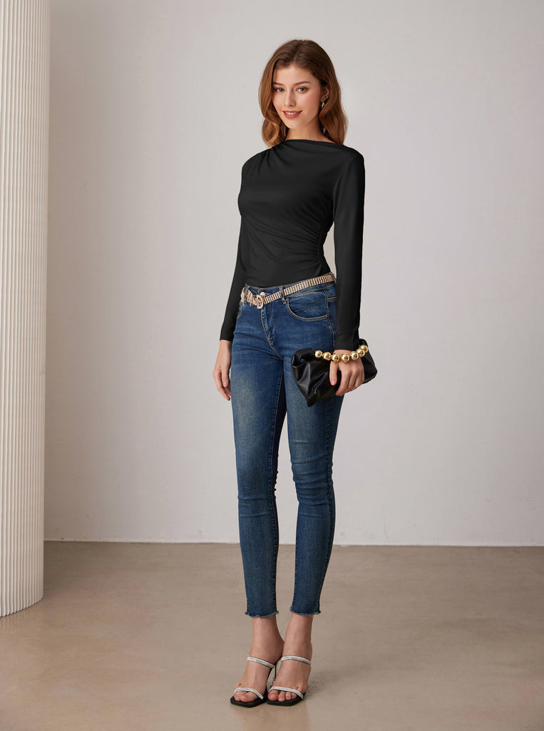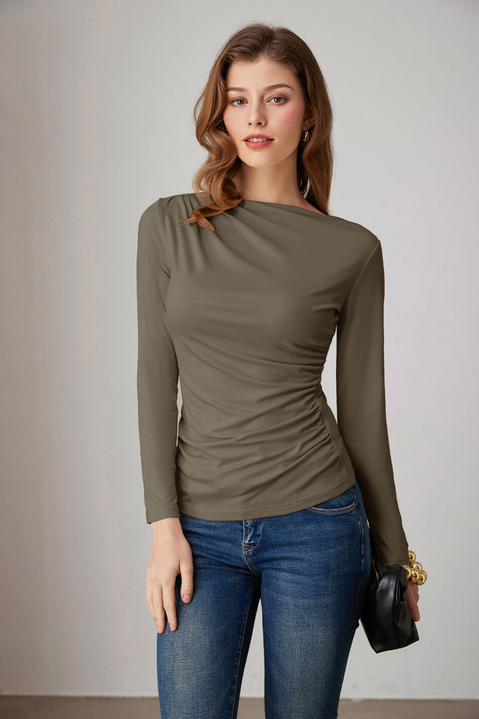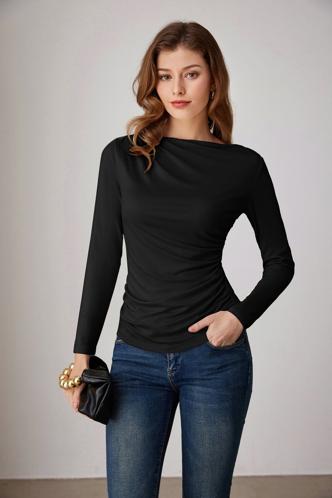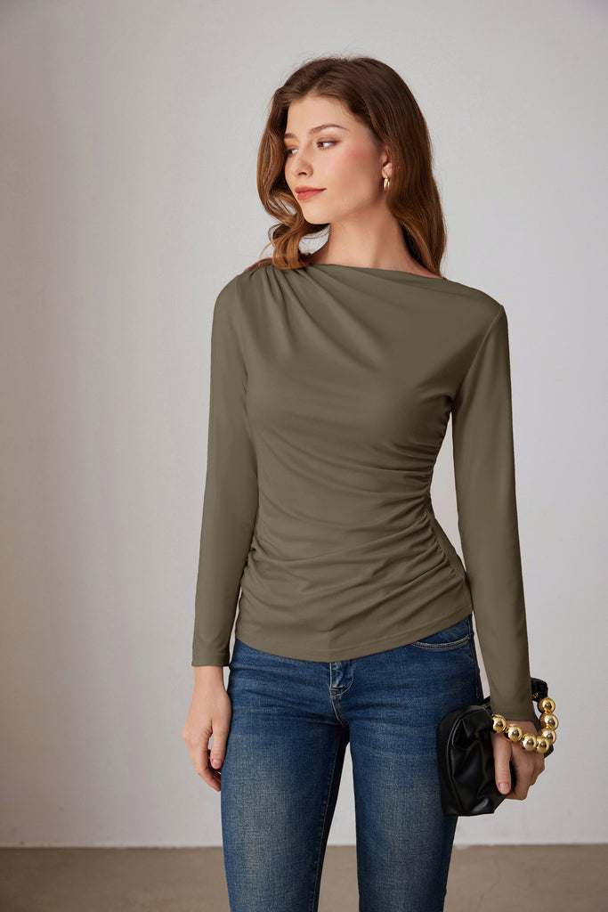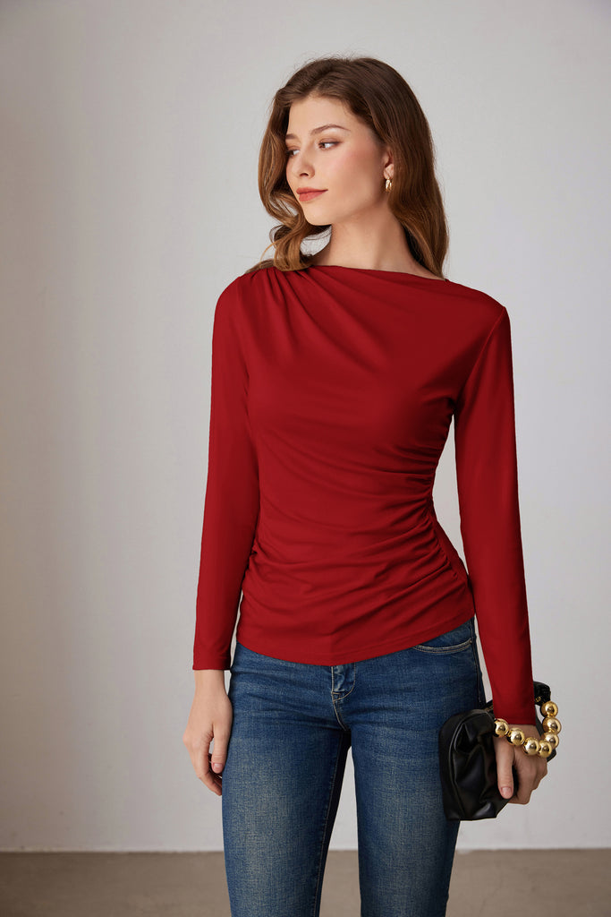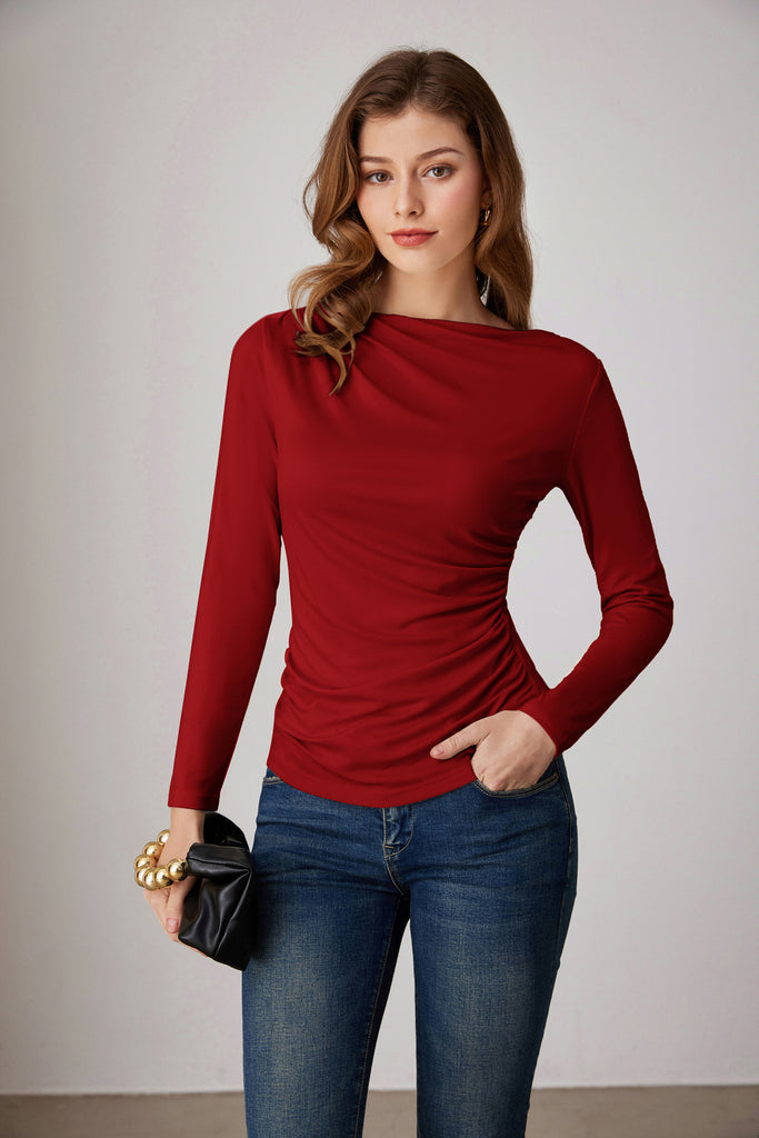 GK Women Ruched Party Tops Comfy Long Sleeve Boat Neck T-Shirt Tops