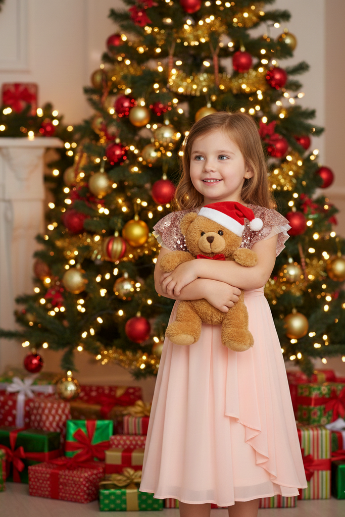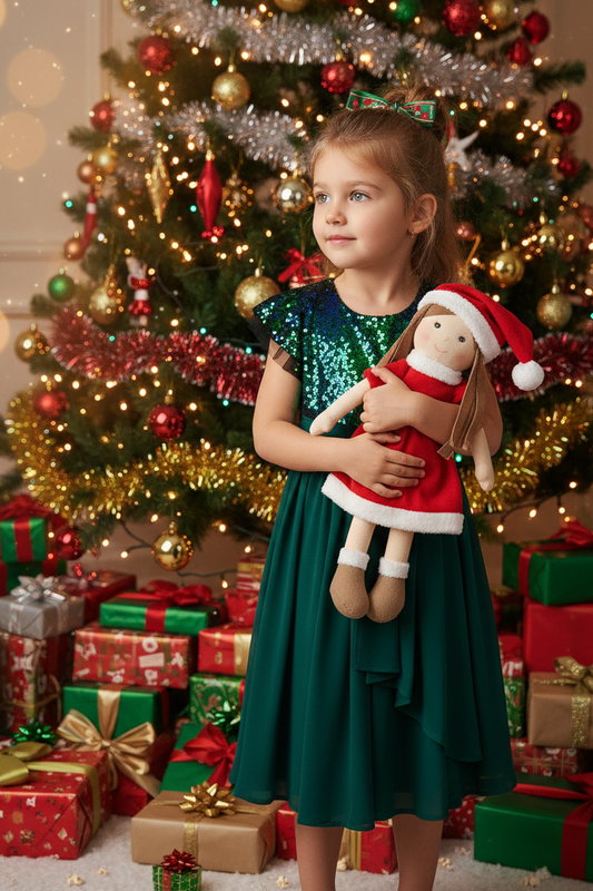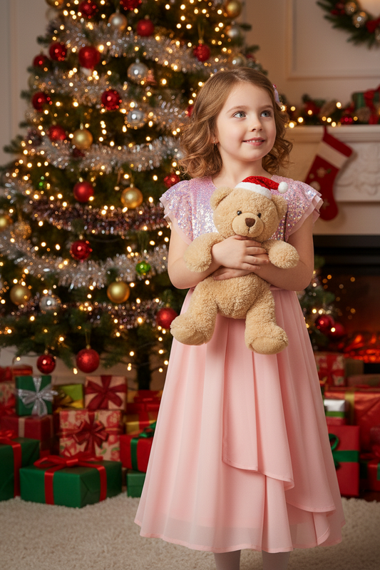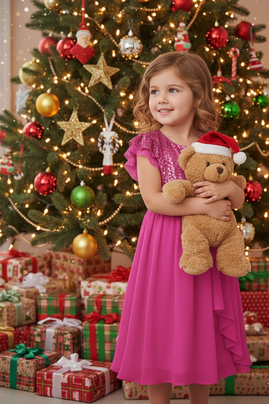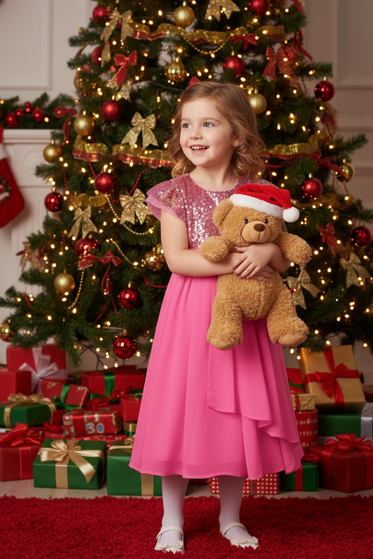 GK Kids Sequin & Chiffon Patchwork Dress Flutter Sleeve Crew Neck A-Line Dress