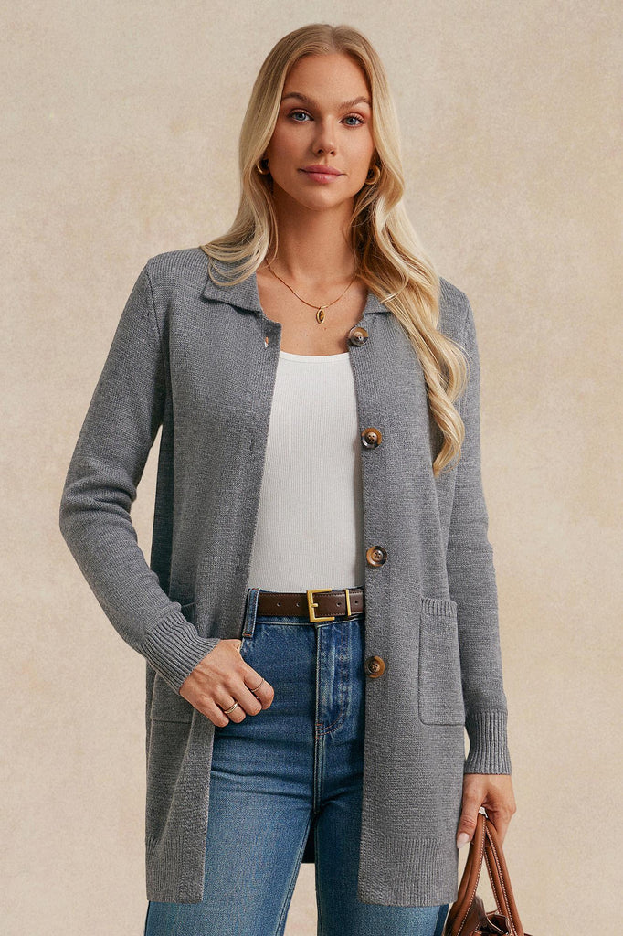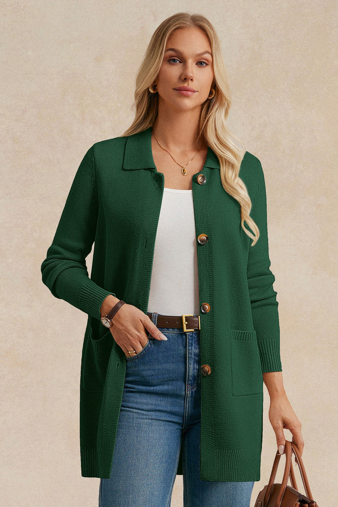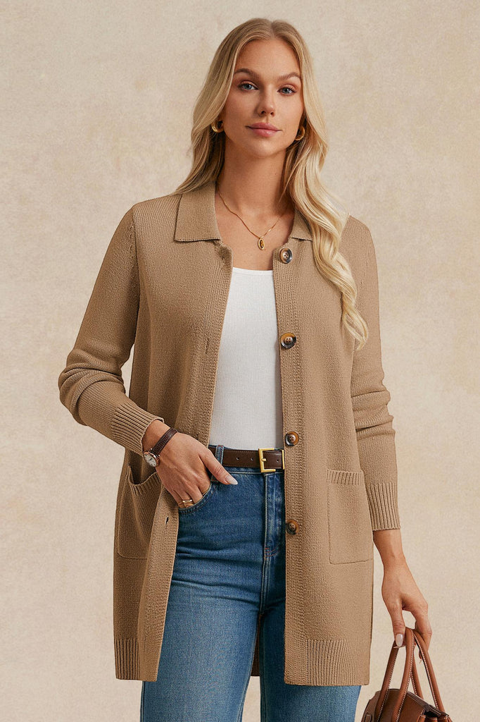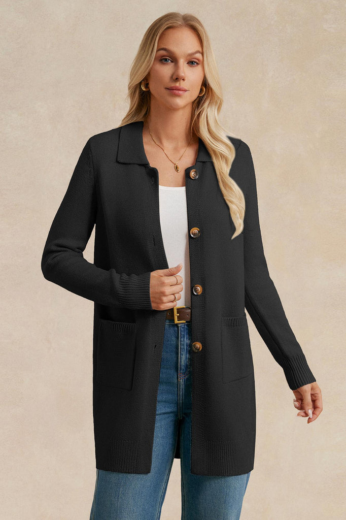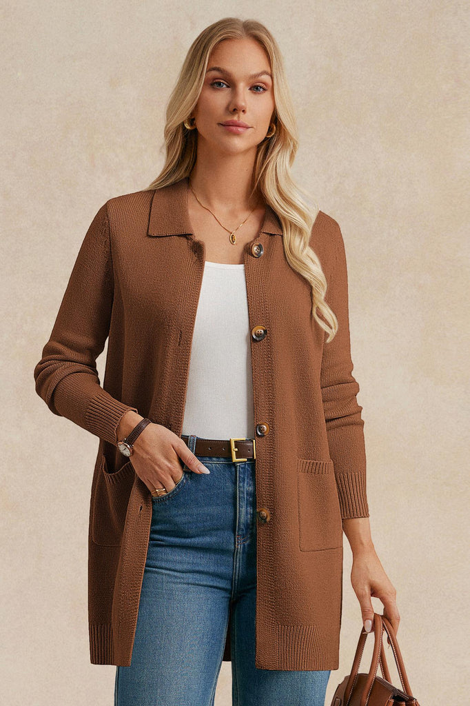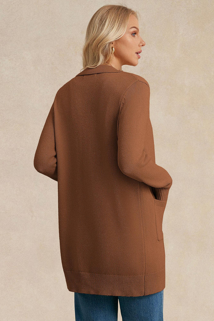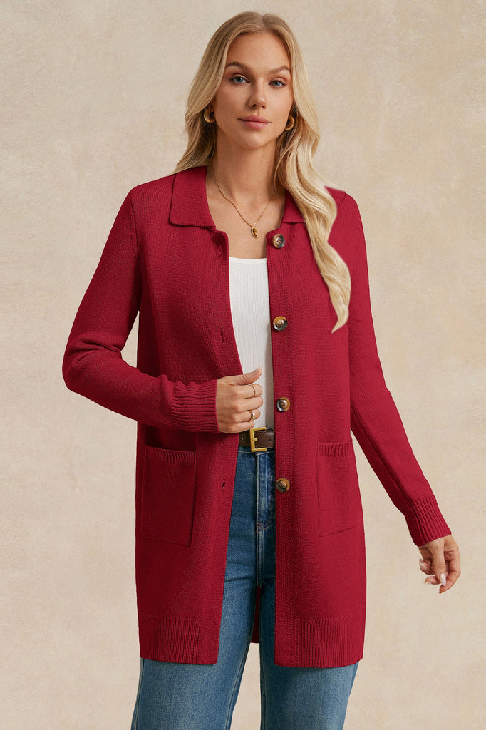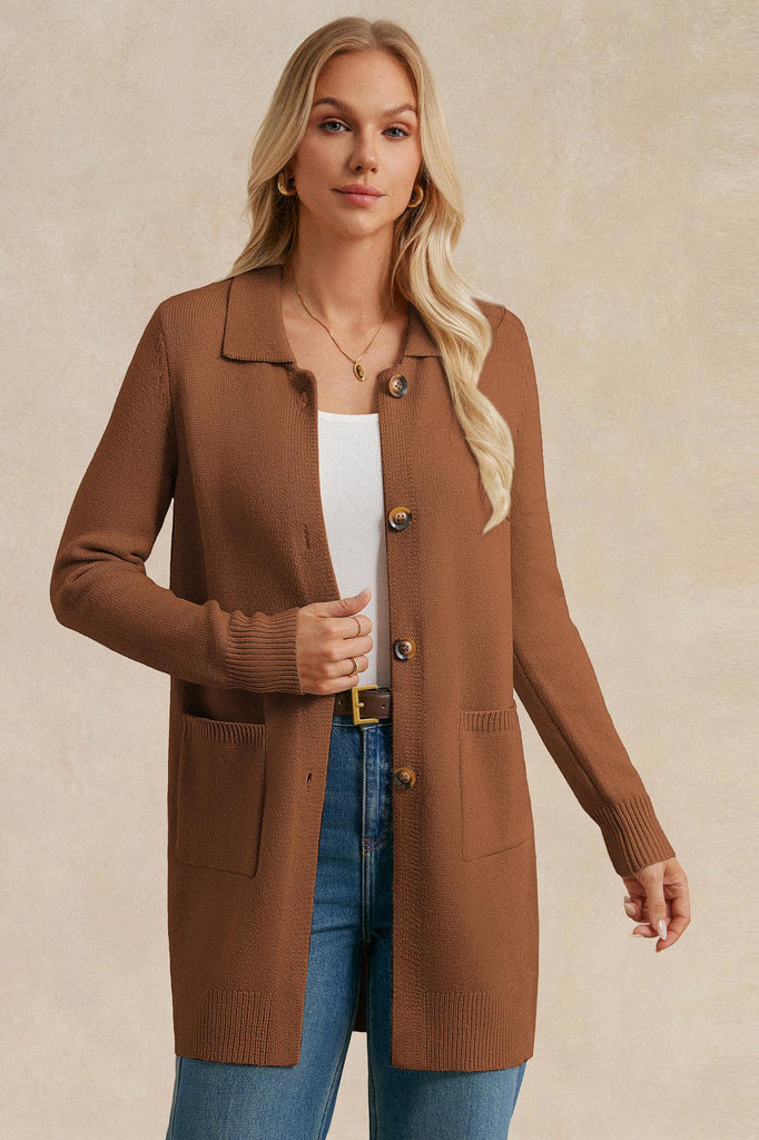 GK Women Mid-Thigh Length Cardigan Long Sleeve Lapel Collar Button-up Sweater