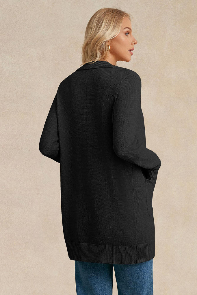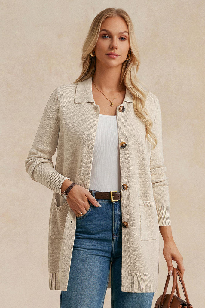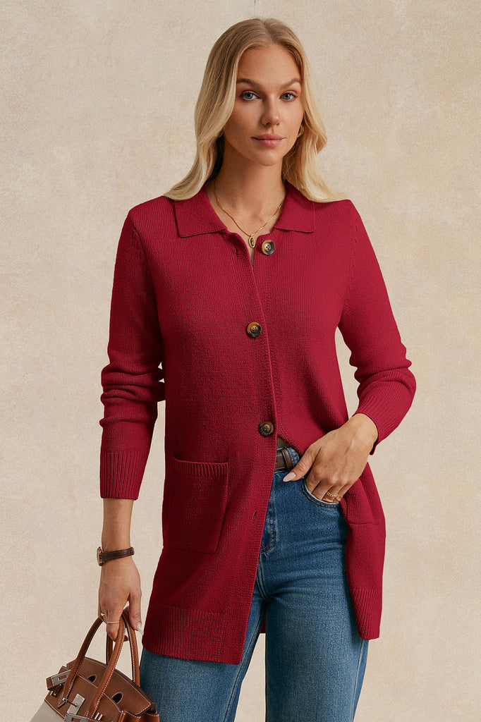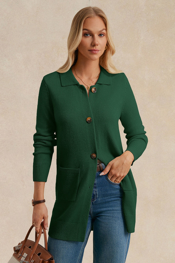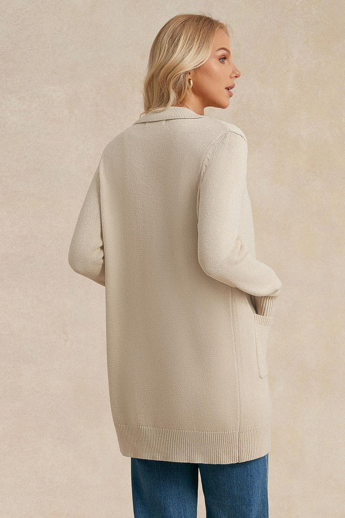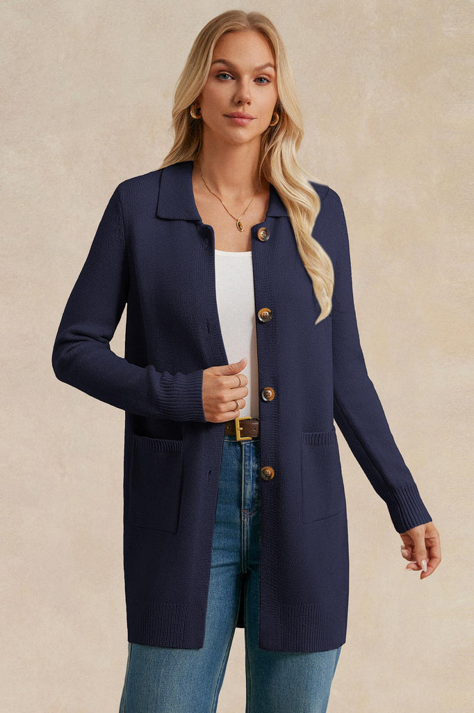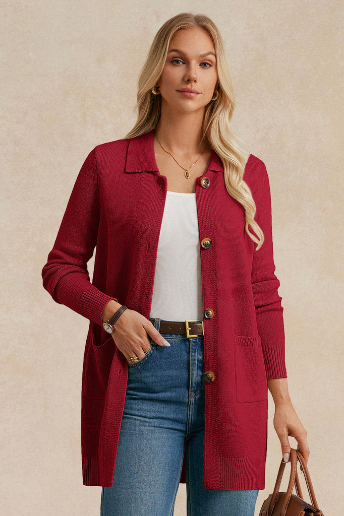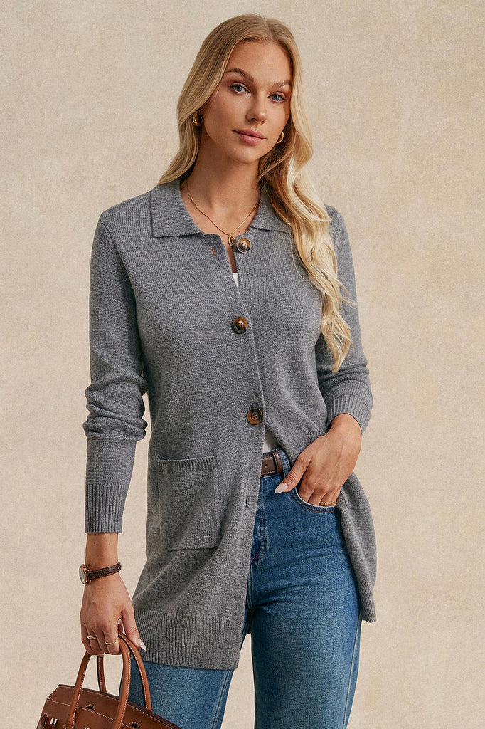 GK Women Mid-Thigh Length Cardigan Long Sleeve Lapel Collar Button-up Sweater