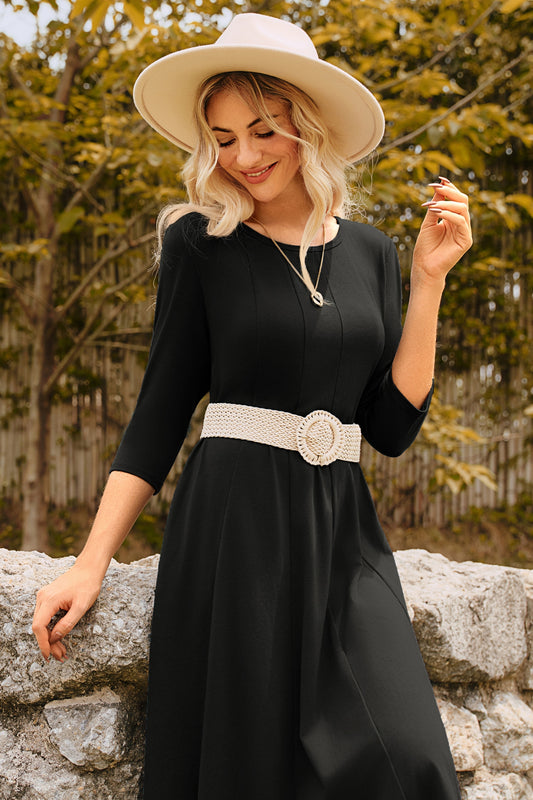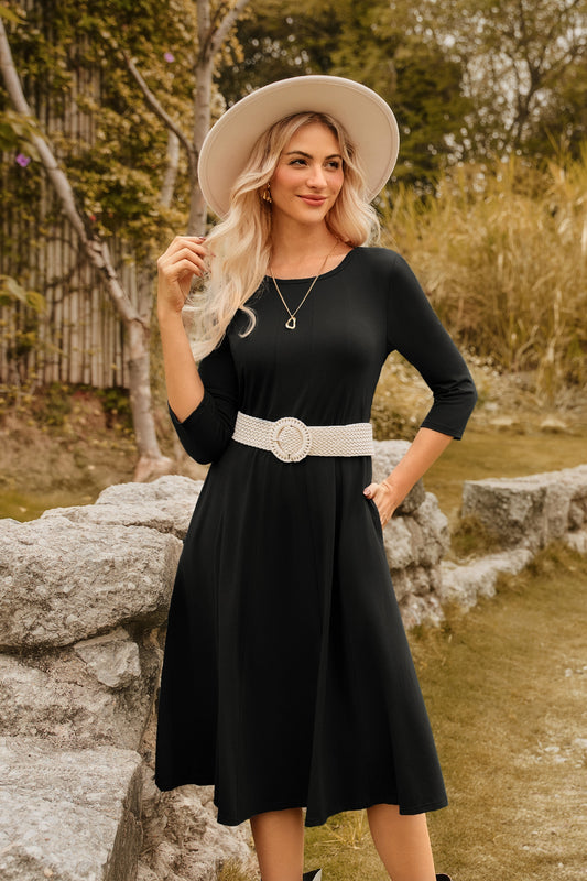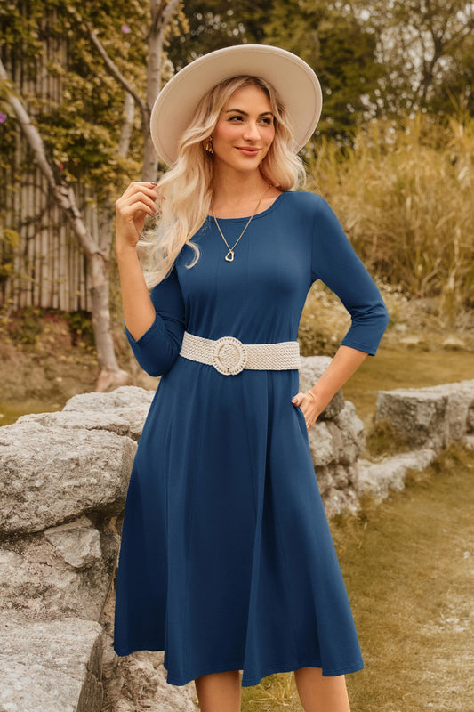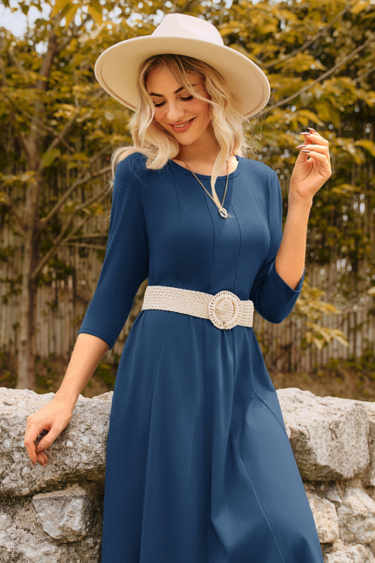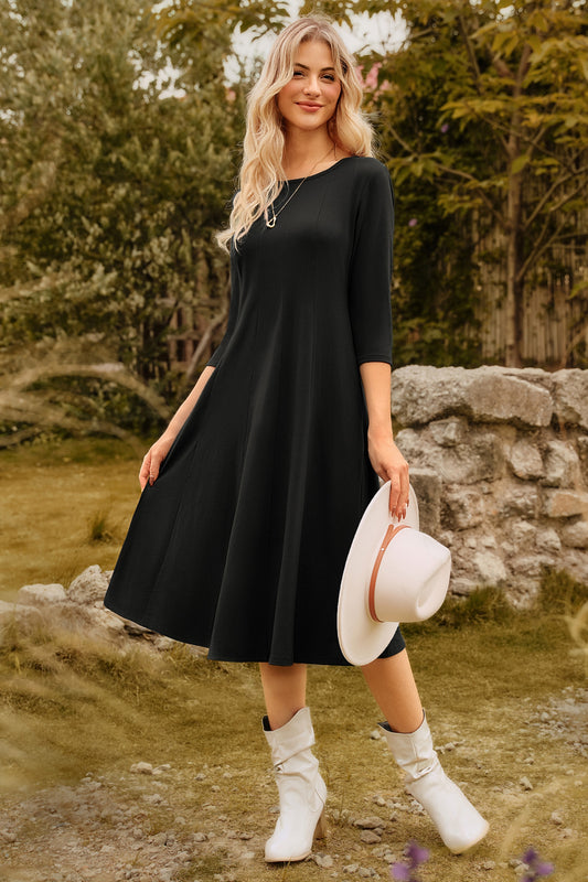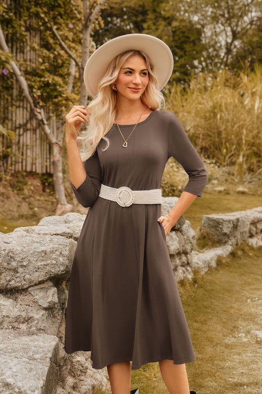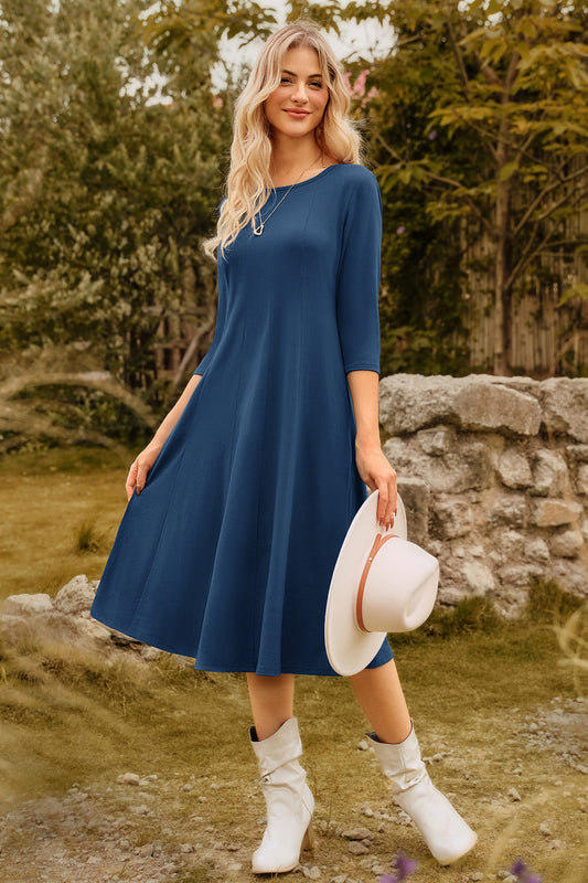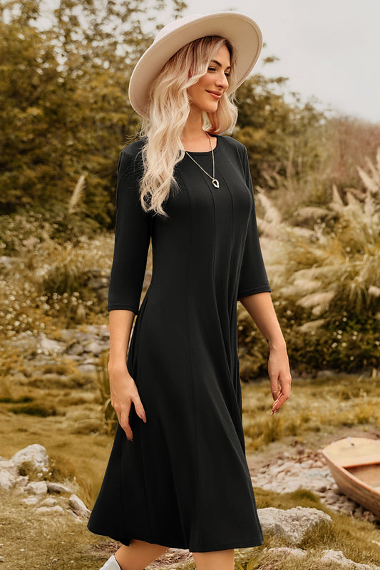 Casual Crew Neck 3/4 Sleeve Midi Dress with Pockets