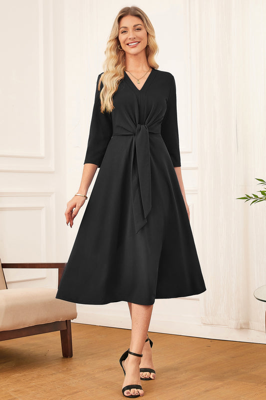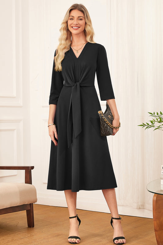 GK Women Dress Belt Decorated Dress 3/4 Sleeve V-Neck Mid-Calf A-Line Dress