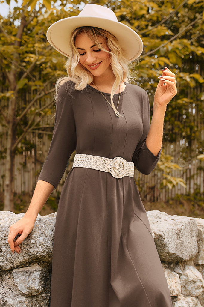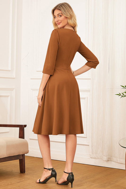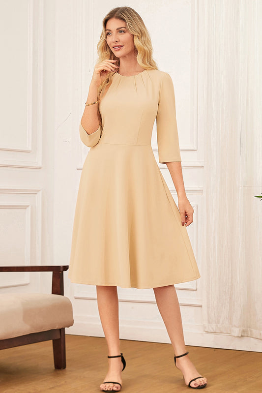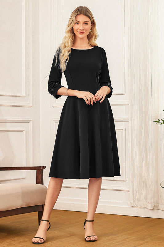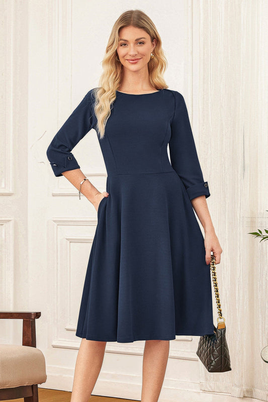 GK Women Boat Neck Dress OL 3/4 Sleeve Below Knee Flared A-Line Dress