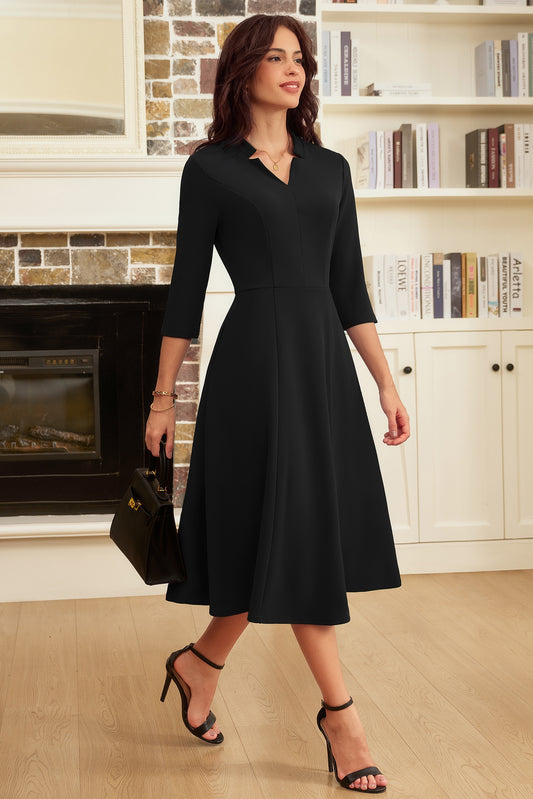 GK Women V-Neck Dress OL 3/4 Sleeve Mid-Calf Length A-Line Dress