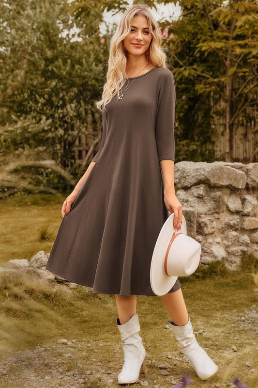 GK Women Below Knee Dress Casual 3/4 Sleeve Crew Neck Flared A-Line Dress