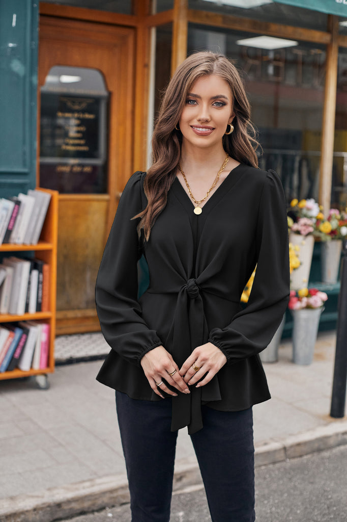 Casual Bow-Knot V-Neck Long Sleeve A-Line Tops - Green