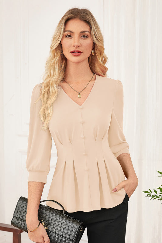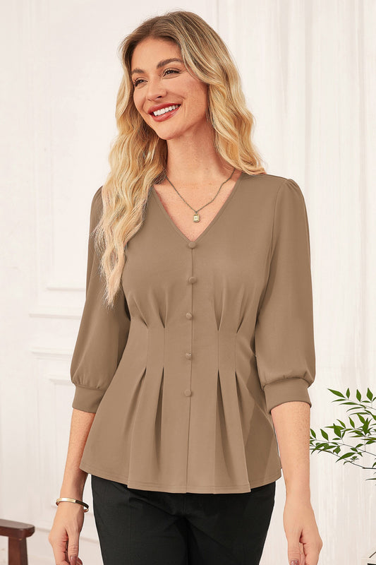 GK Women Pleated Front Tops OL 3/4 Sleeve V-Neck Button Decorated Pullover Tops