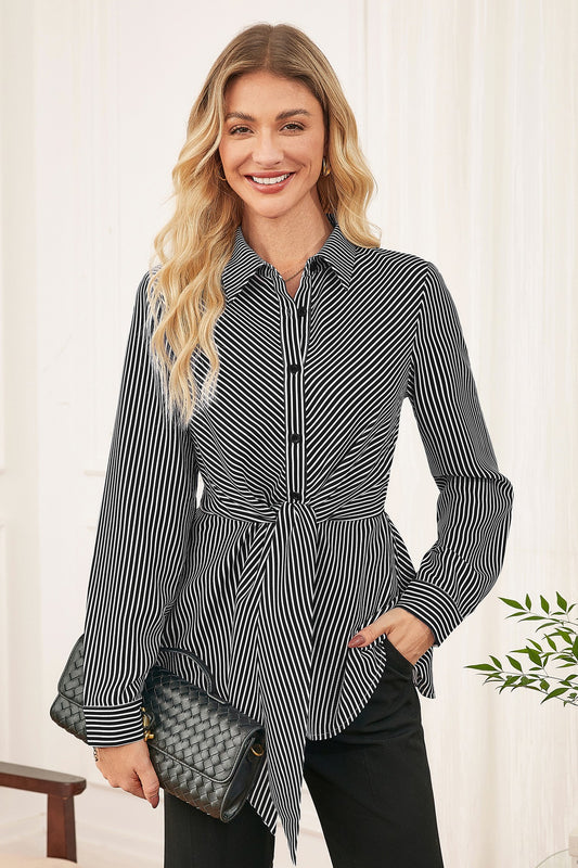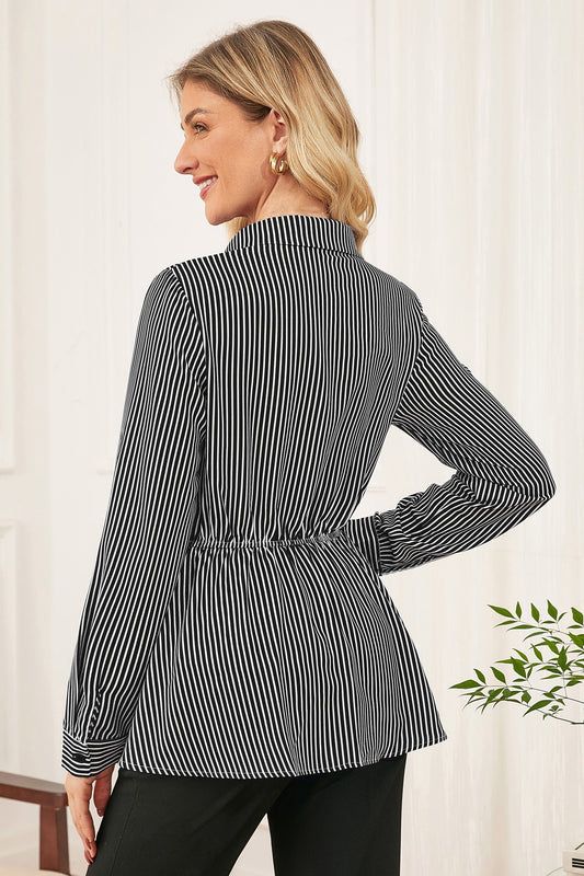 GK Women Striped Shirt OL Long Sleeve Lapel Collar Elastic Waist Shirt Tops
