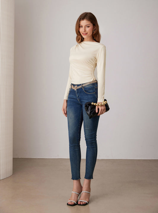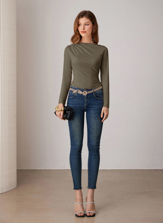 Casual Crewneck Cutout Ruched Slit Long Sleeve Tops