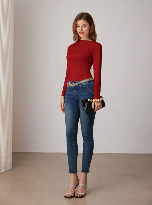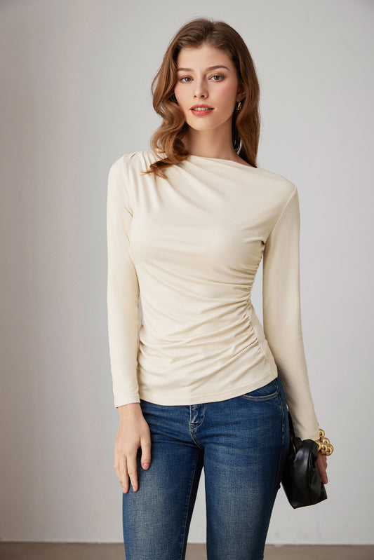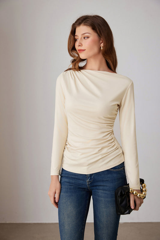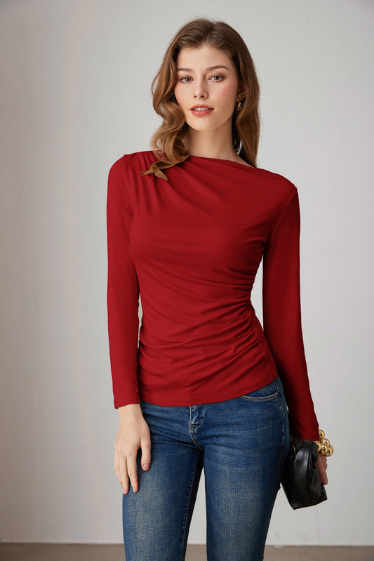 GK Women Ruched Party Tops Comfy Long Sleeve Boat Neck T-Shirt Tops
