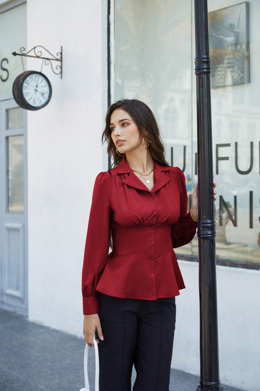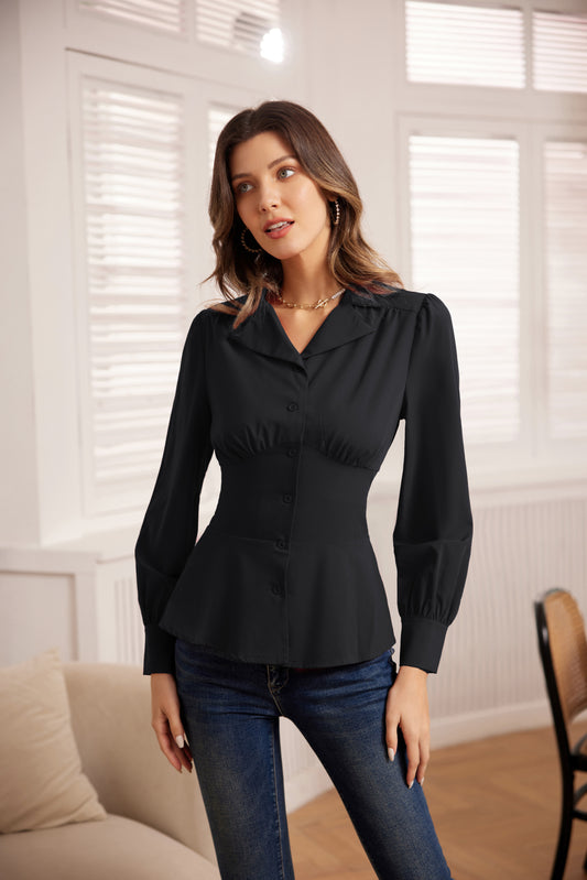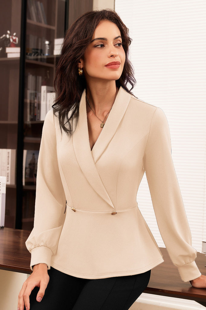 GK Women Peplum Hem Tops OL Long Sleeve Shawl Lapel Surplice V-Neck Tops