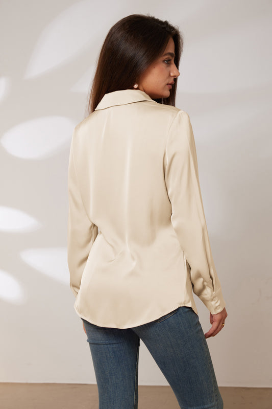 GK Women Lapel Collar Tops OL Long Sleeve V-Neck Handkerchief Hem Button-up Tops